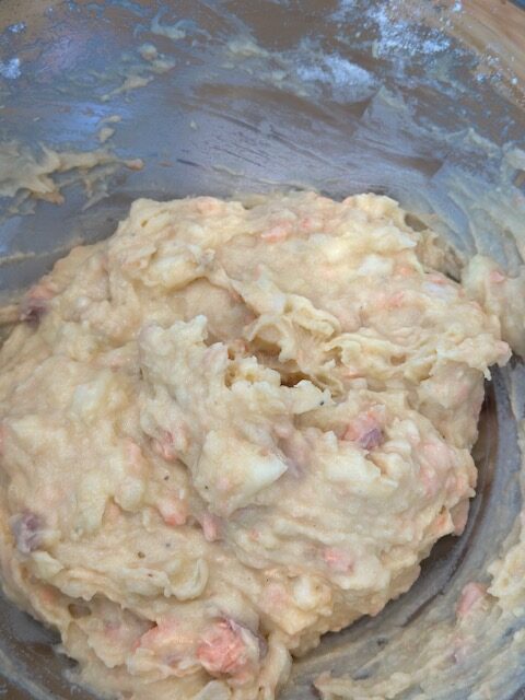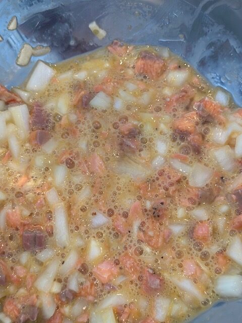 1. Mix salmon, eggs, onions, garlic, and mashed potatoes